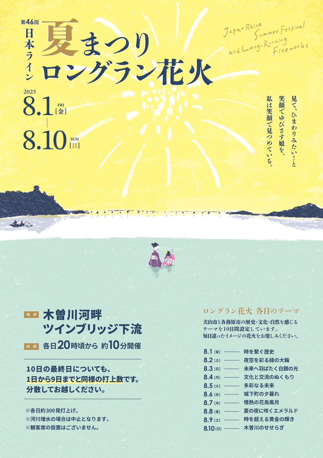 | 開催場所 | 木曽川河畔(ツインブリッジ下流) ※観覧席は設けません。 ※少雨決行、増水などの場合は中止 ※10日の最終日の花火につきましても、1日から9日までと同様、20:00頃から約10分間(300発程度)の打ち上げとなります。 |