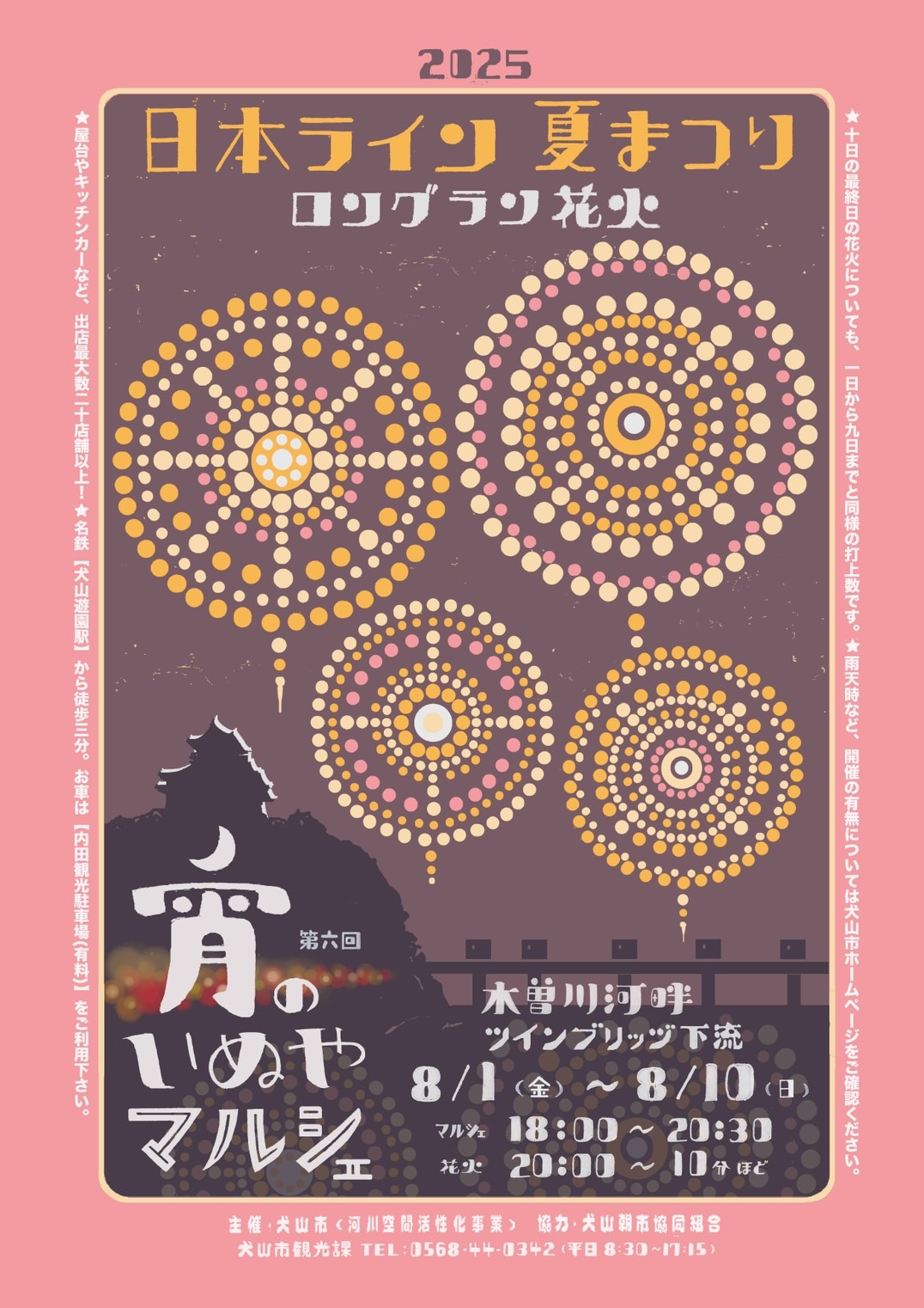 木曽川沿い一帯(夕刻より混雑します)観覧スポットは名鉄「犬山遊園駅」西口すぐです。おでかけは公共交通機関をご利用ください。