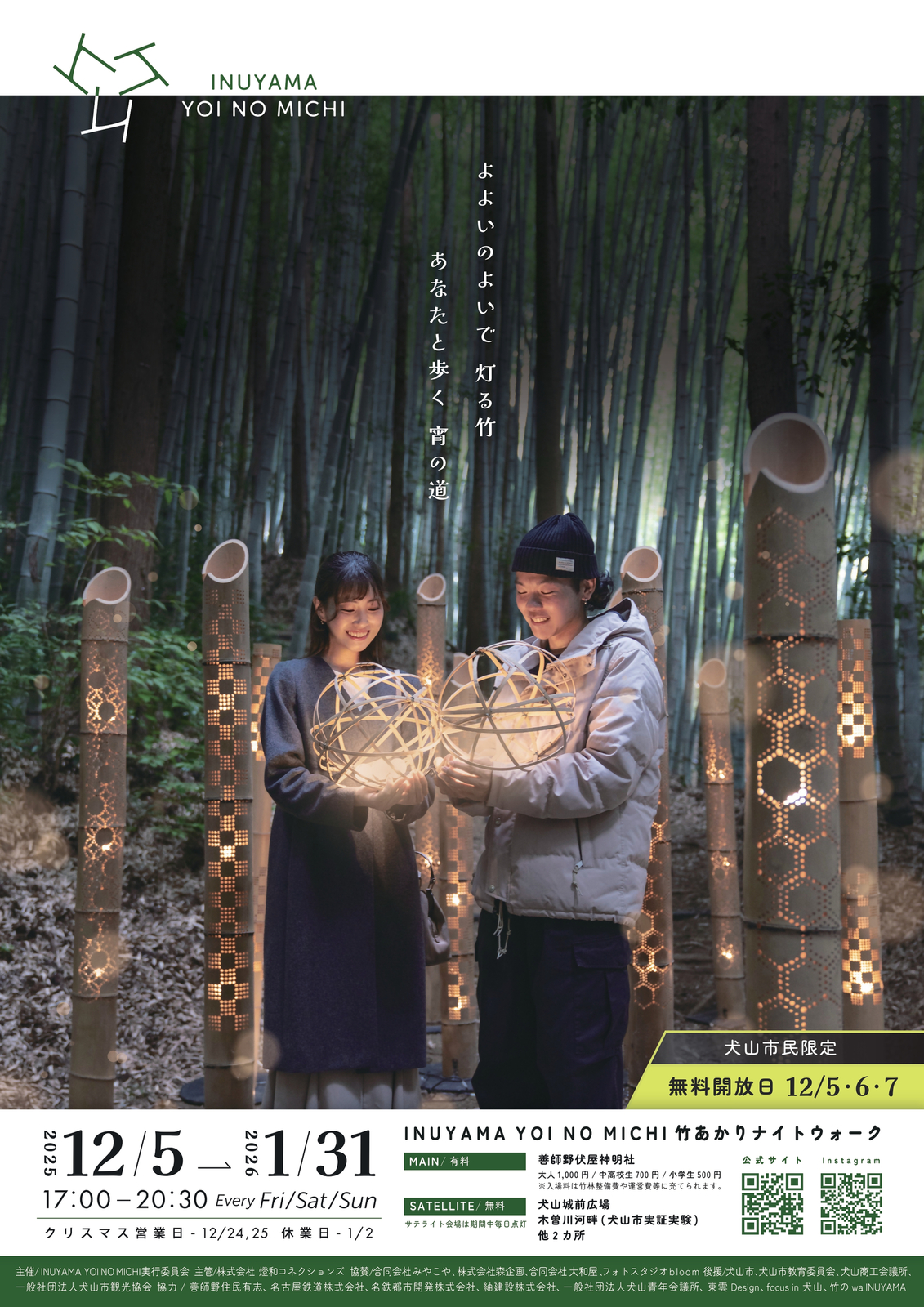 犬山市内の周遊や滞在時間の延長、さらには閑散期のコンテンツを充実させて混雑期における観光客の分散化・平準化を図るため「INUYAMA YOI NO MICHI 竹あかりナイトウォーク」を開催します。全5カ所で設置する竹あかりから個々の模様や冬の静けさを感じ取りながら、夜の町歩きをお楽しみください。