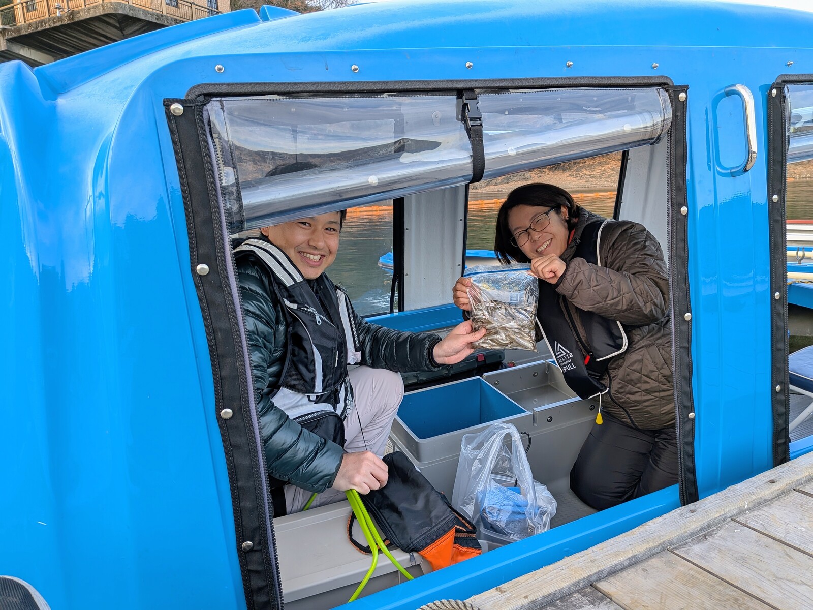 はじめての方は、8:00ごろまでに受付を済ませて、14:00ごろまでチャレンジすれば平均して30~50匹ほど釣れます。釣ったワカサギは持ち帰ることができます。各家庭で天ぷらや唐揚げにしてお召し上がりください。