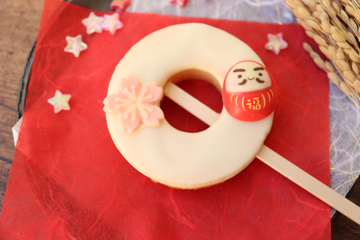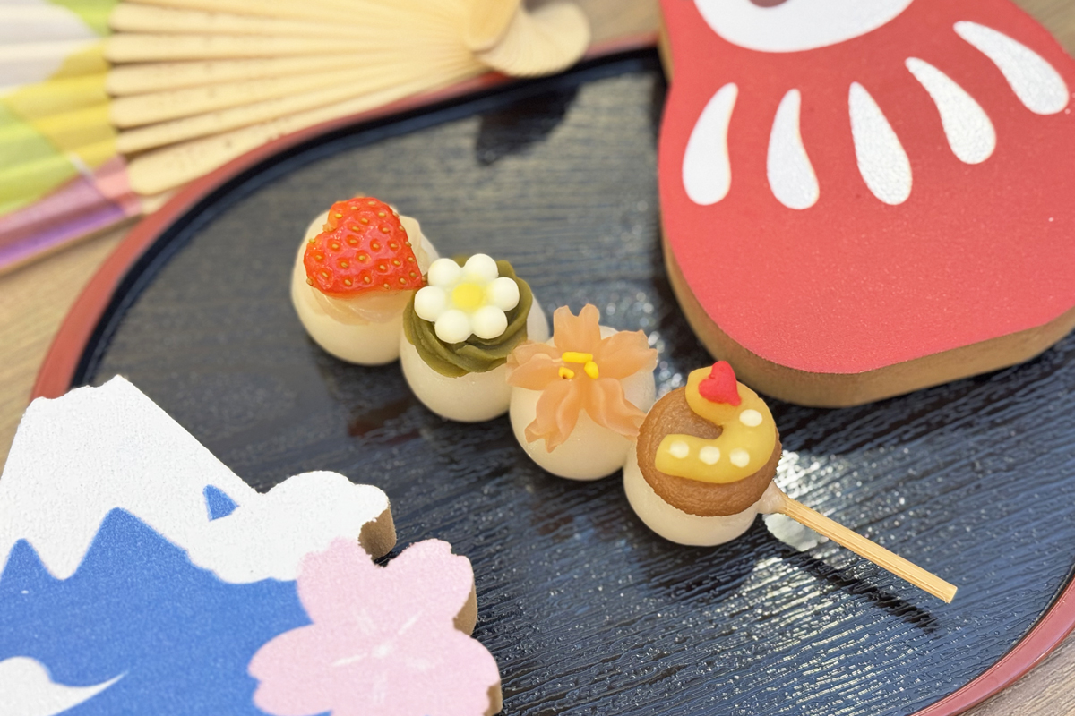 縁起物を集めて作られた4つ玉だんご。ハートのイチゴは恋愛成就、丸いお花はすべて丸くおさまる。桜は春咲く合格。