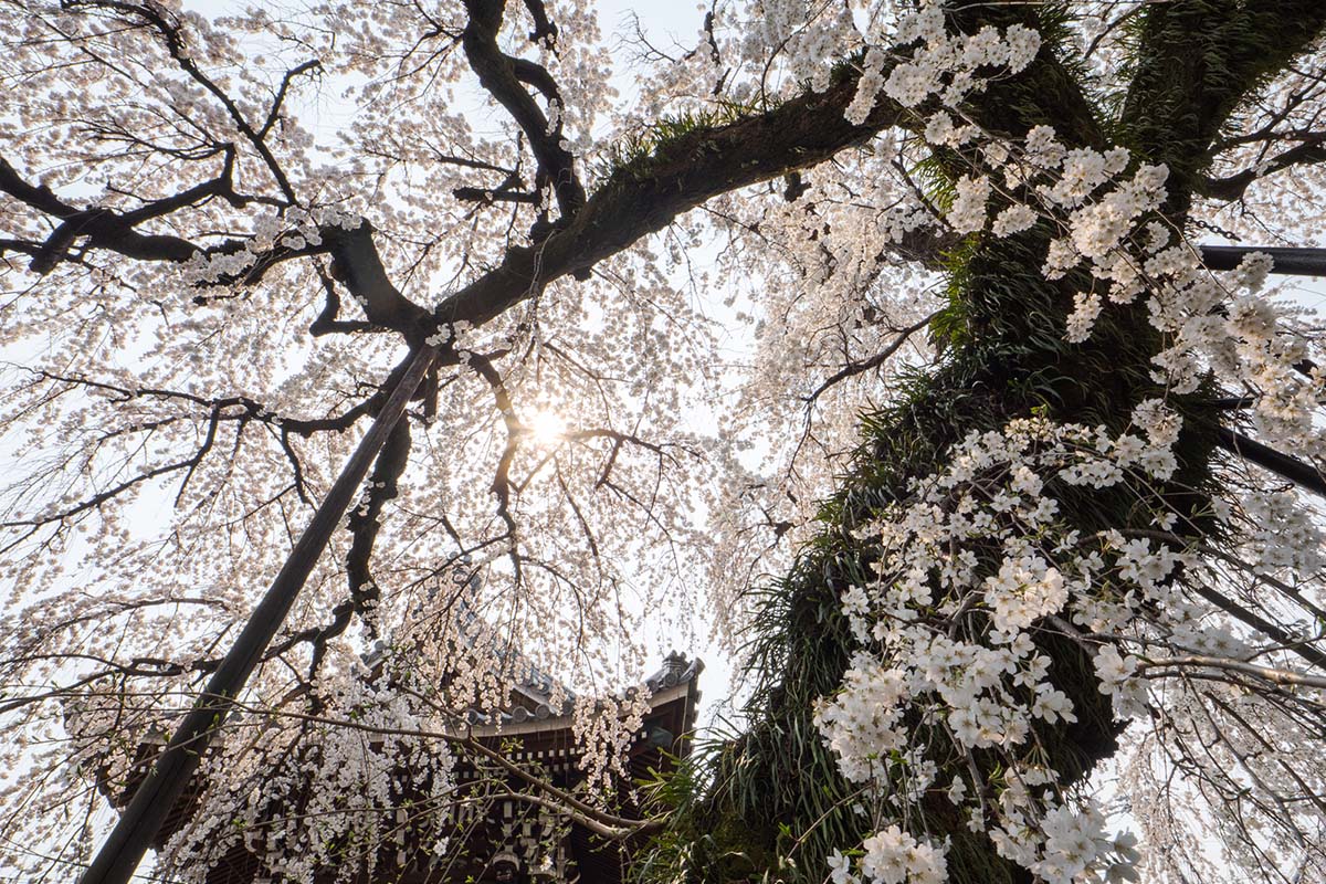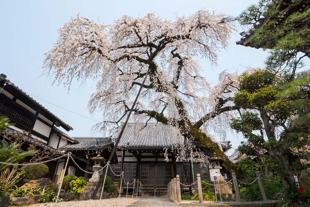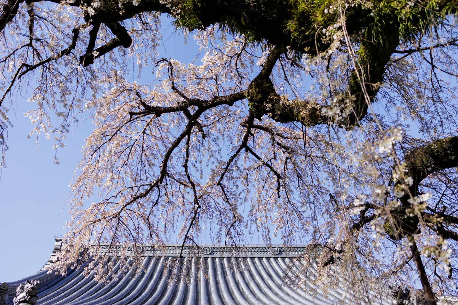 山門をくぐると、本堂前に立つ一本のシダレザクラが訪れる人を迎えます。