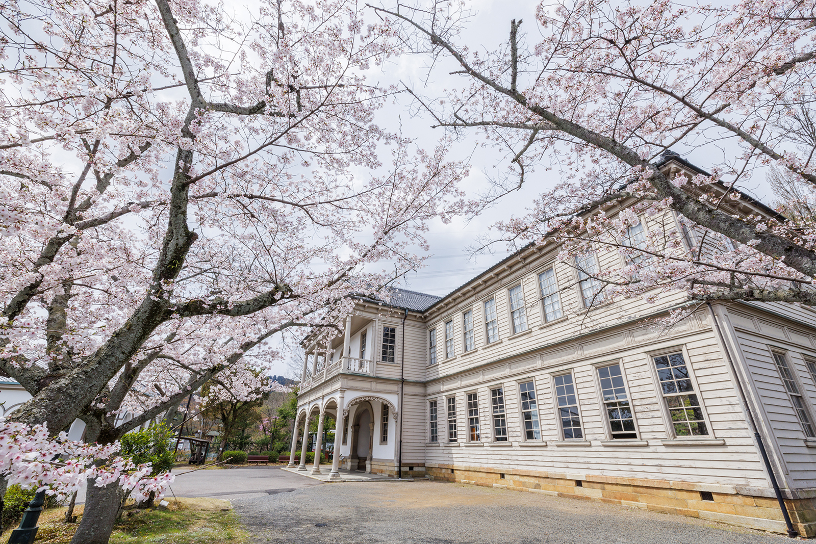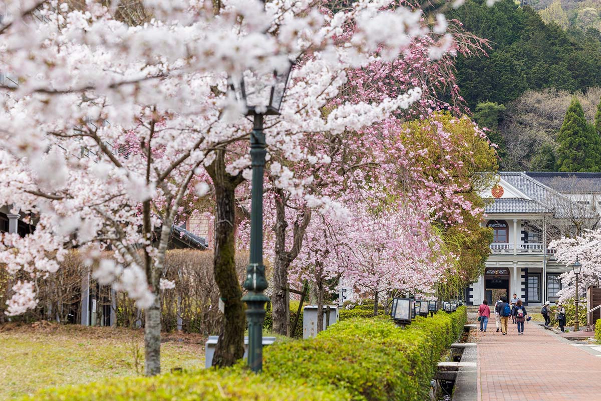 春には村内各所で桜が咲き、洋館や校舎、教会などの建築とやわらかな花色が調和した、明治村ならではの風景が広がります。