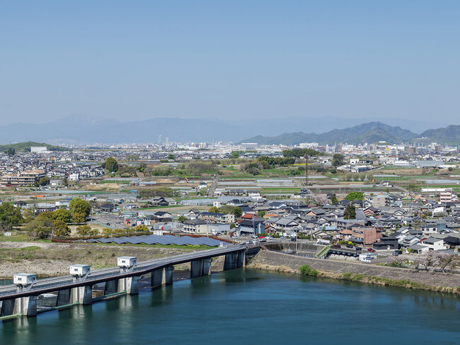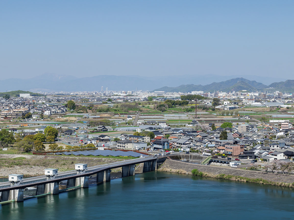 南側には名古屋や小牧山城まで続く濃尾平野が広がります。犬山は、木曽川が運んだ土砂でできた巨大な扇状地の「扇の要(頂点)」に位置します。ここから南はなだらかに下る地形で遮る山がないため、尾張を統一した信長にとって、濃尾平野に広がる領地を見渡すことのできる絶好の場所だったのです。