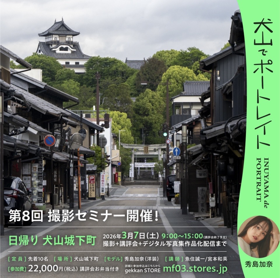 3月6日(金)3月7日(土)開催いたします。(日帰りプランのみ)6日は梅園も美しい、大縣神社で、着物姿のモデルさんの撮影セミナー。7日は古い町並みで人気の犬山城下町での、私服での撮影です。日本のポートレイトの第一人者である魚住誠一氏と、編集者でプロデューサーである宮本和英氏の指導を受けて、撮影技術や写真セレクトの極意を学びましょう。