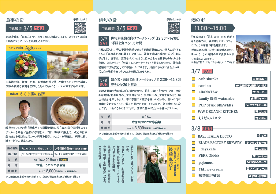 雄大な渓谷美をたたえる木曽川に、お酒が楽しめる高級遊覧船「有楽丸」が出航します。3月7日は「Agio」がイタリア料理とワイン、3月8日は「さそり座の台所」が中国料理とお酒を提供。それぞれの店舗がふるまう選りすぐりの料理とお酒のマリアージュをお楽しみください。
