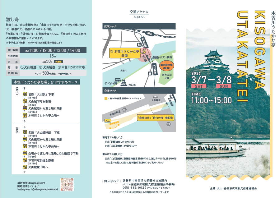 令和8年3月7日(土)と8日(日)に犬山・各務原広域観光推進協議会主催の「木曽川うたかた亭」を開催します。春風に揺れる景勝地「日本ライン」や「国宝犬山城」の景色を船上や対岸から眺めながら、犬山・各務原のさまざまな魅力をお楽しみください。