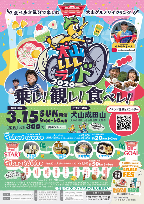 そんな1日体験できる、観光×グルメ×サイクリングの周遊サイクリングイベント 「犬山レレレライド2026」を、2026年3月15日(日)に愛知県犬山市で開催します。