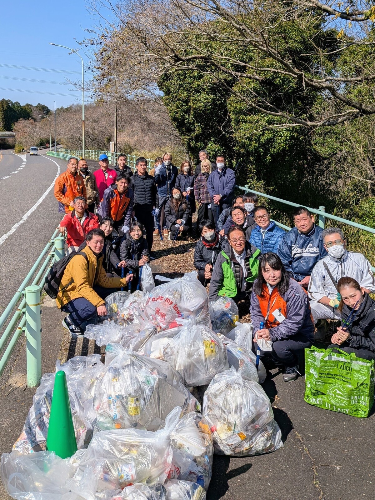 春休みを前に明治村、リトルワールド、モンキーパークをつなぐ道路をきれいにしようと、名鉄グループ各社、小牧法人会、犬山ポタリングクラブ、犬山朝市組合、市内ホテル関係者、犬山成田山、市職員など46名が参加。約2時間で70リットル入りのごみ袋約60袋分を回収しました。